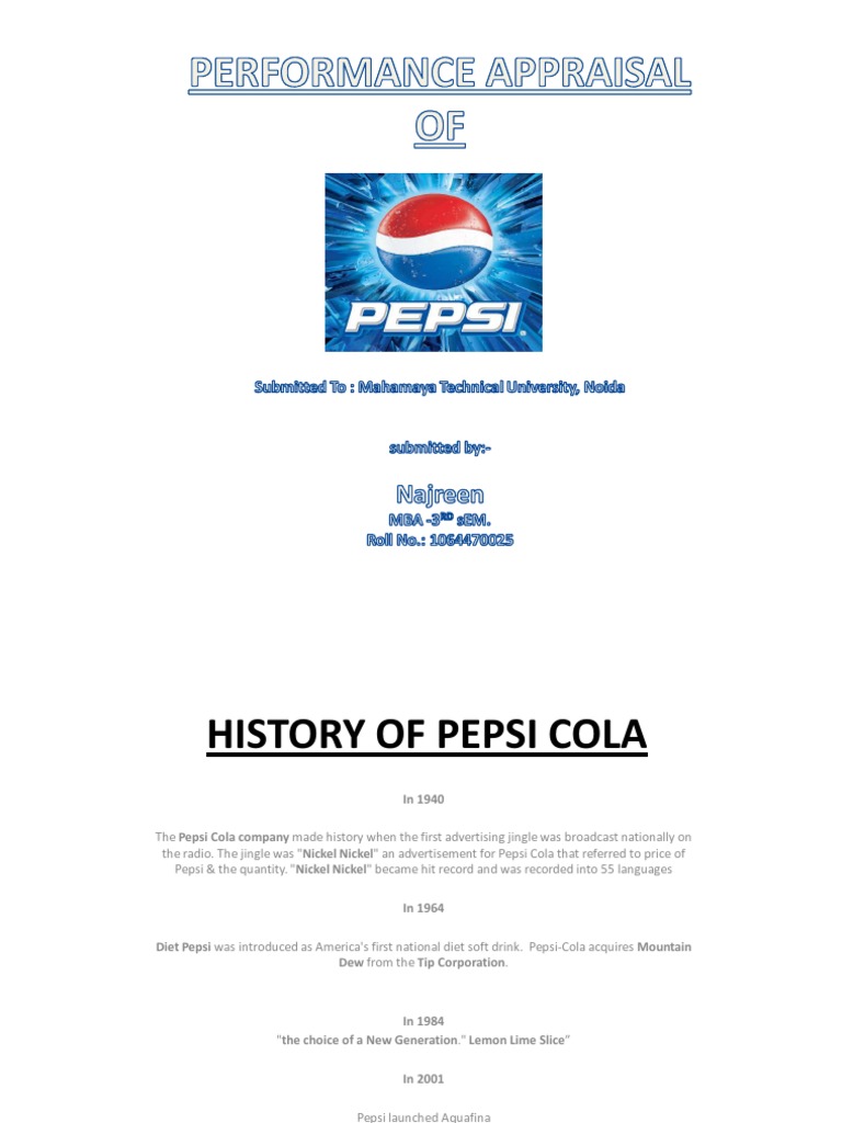 In 1984 "the choice of a New Generation." Lemon Lime Slice In 2001 Pepsi launched Aquafina In 2006 Pepsi launched a new flavoured Pepsi drink named PEPSI CAFTINO with Coffee flavour.