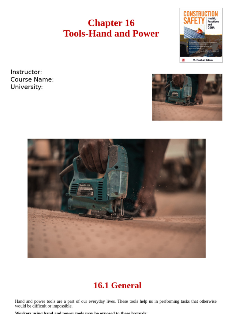 • This chapter discussed the various types of tools and their general safety precautions. Electric power tools