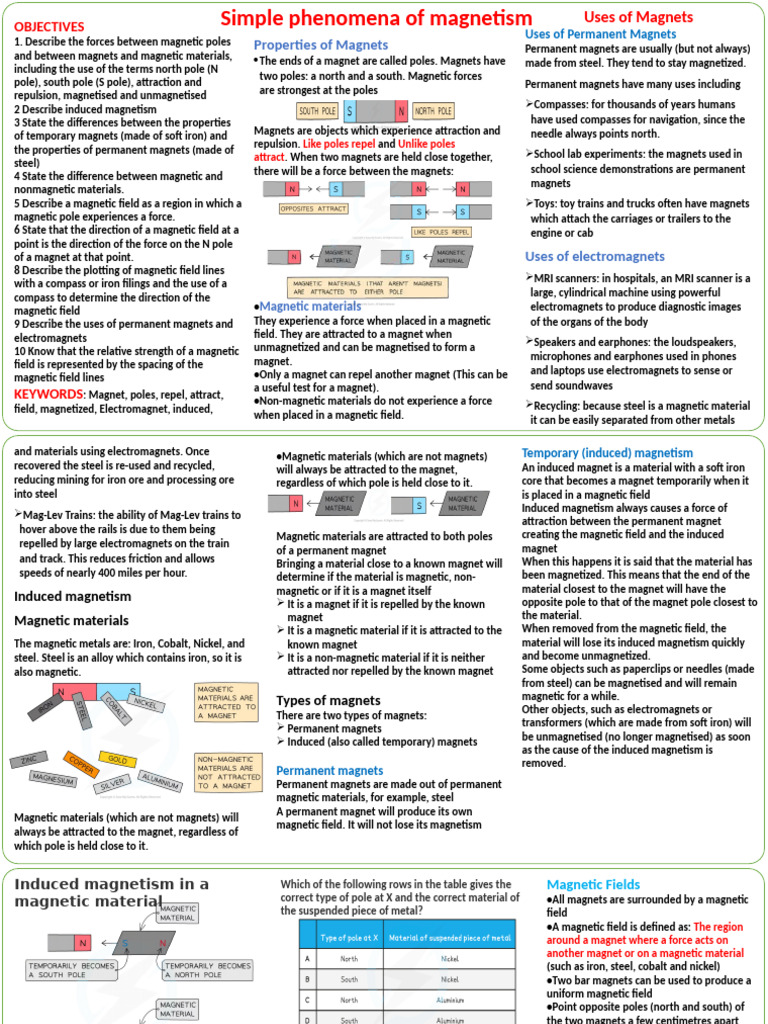 of temporary magnets (made of soft iron) and Magnets are objects which experience attraction and needle always points north.