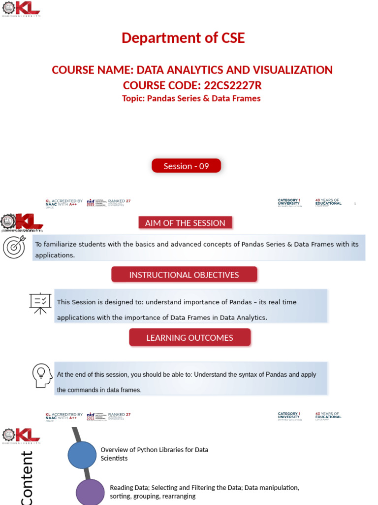 To familiarize students with the basics and advanced concepts of Pandas Series & Data Frames with its