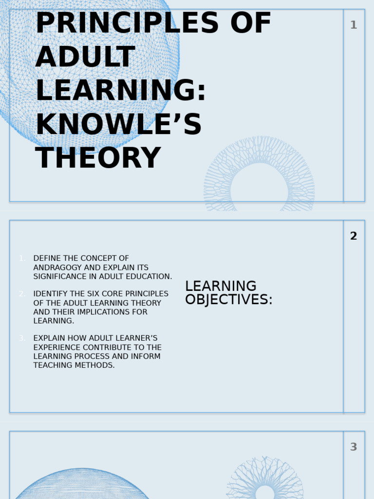 Knowles, andragogy is the art and science of adult learning,