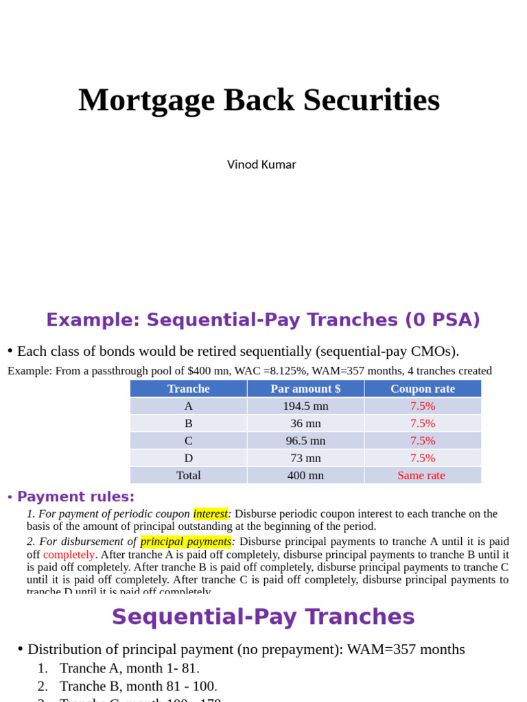 Example: From a passthrough pool of $400 mn, WAC =8.125%, WAM=357 months, 4 tranches created
