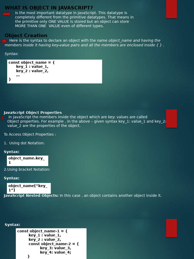 JavaScript Nested Objects: In this case , an object contains another object inside it.