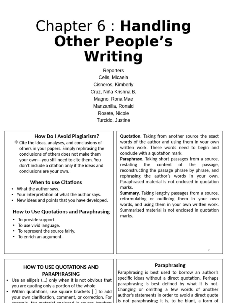 • Your interpretation of what the author says. Summary. Taking lengthy passages from a source,