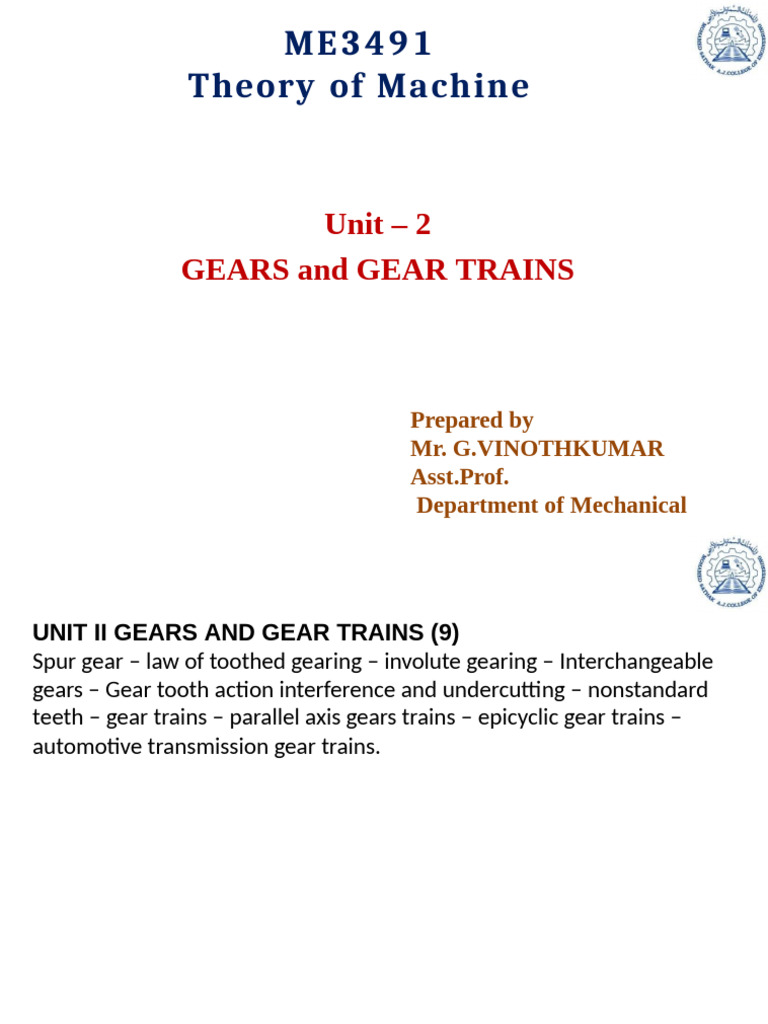 UNIT II GEARS AND GEAR TRAINS (9)