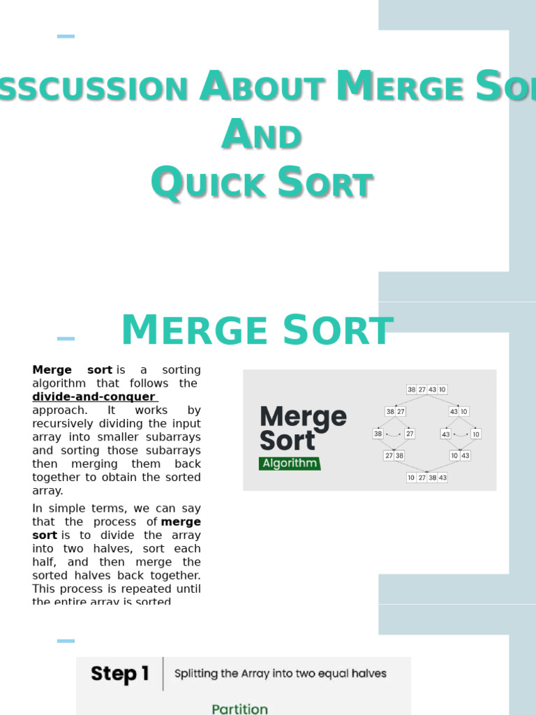 •Stability : Merge sort is a stable sorting algorithm, which means it