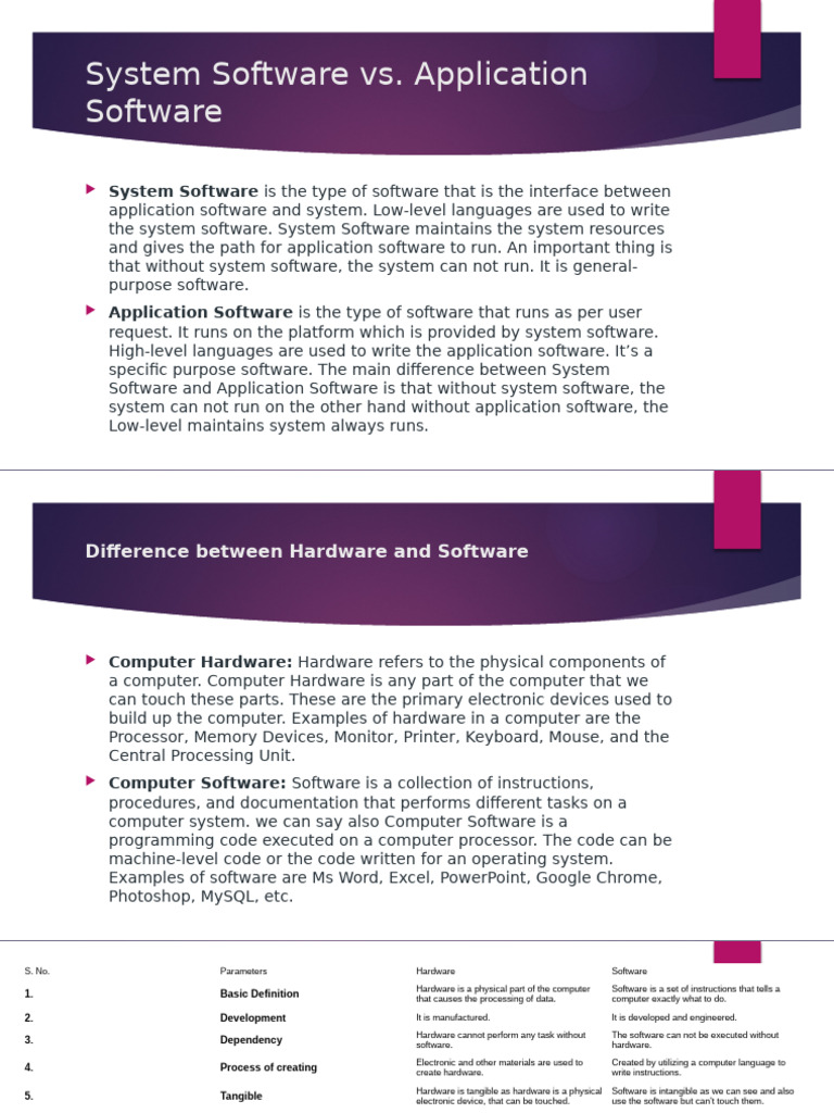 Hardware is a physical part of the computer Software is a set of instructions that tells a