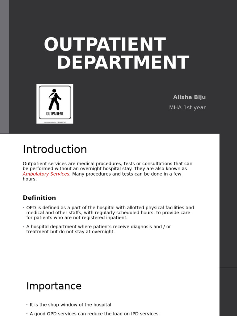 • OPD is defined as a part of the hospital with allotted physical facilities and