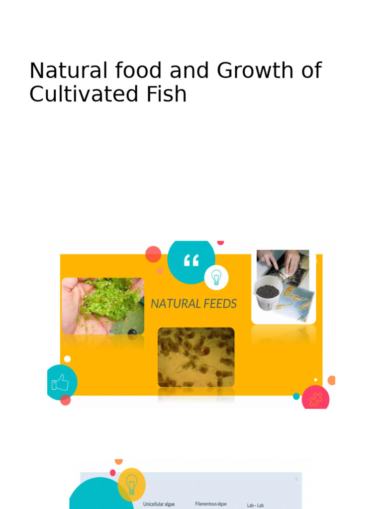 The document discusses the importance of natural food in the growth of cultivated fish. It also covers various types of fish feed, including artificial feeding methods. The focus is on optimizing fish growth through appropriate feeding strategies.