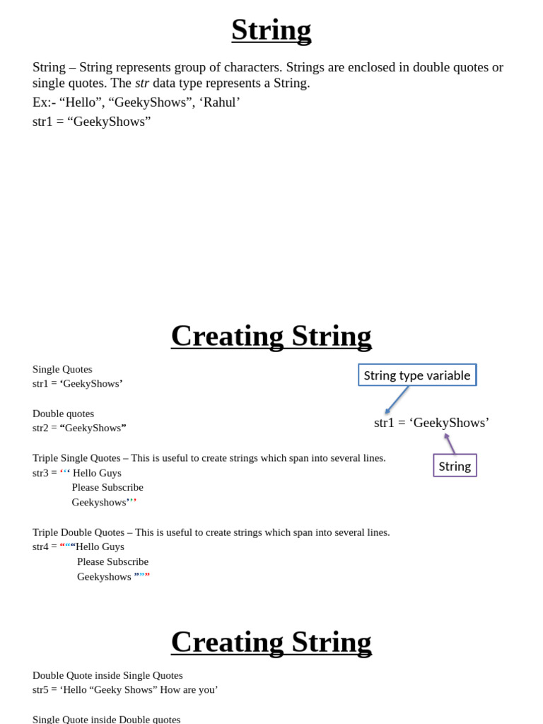 Triple Double Quotes – This is useful to create strings which span into several lines.