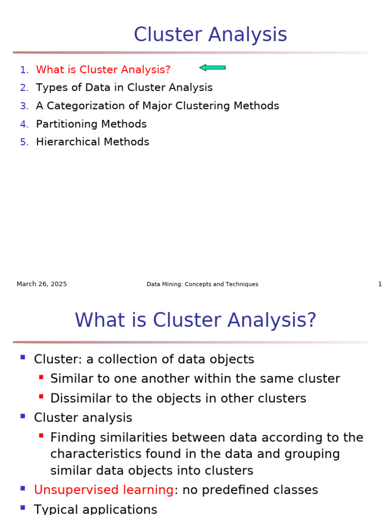 Typical methods: DIANA, AGNES, BIRCH, ROCK, CAMELEON