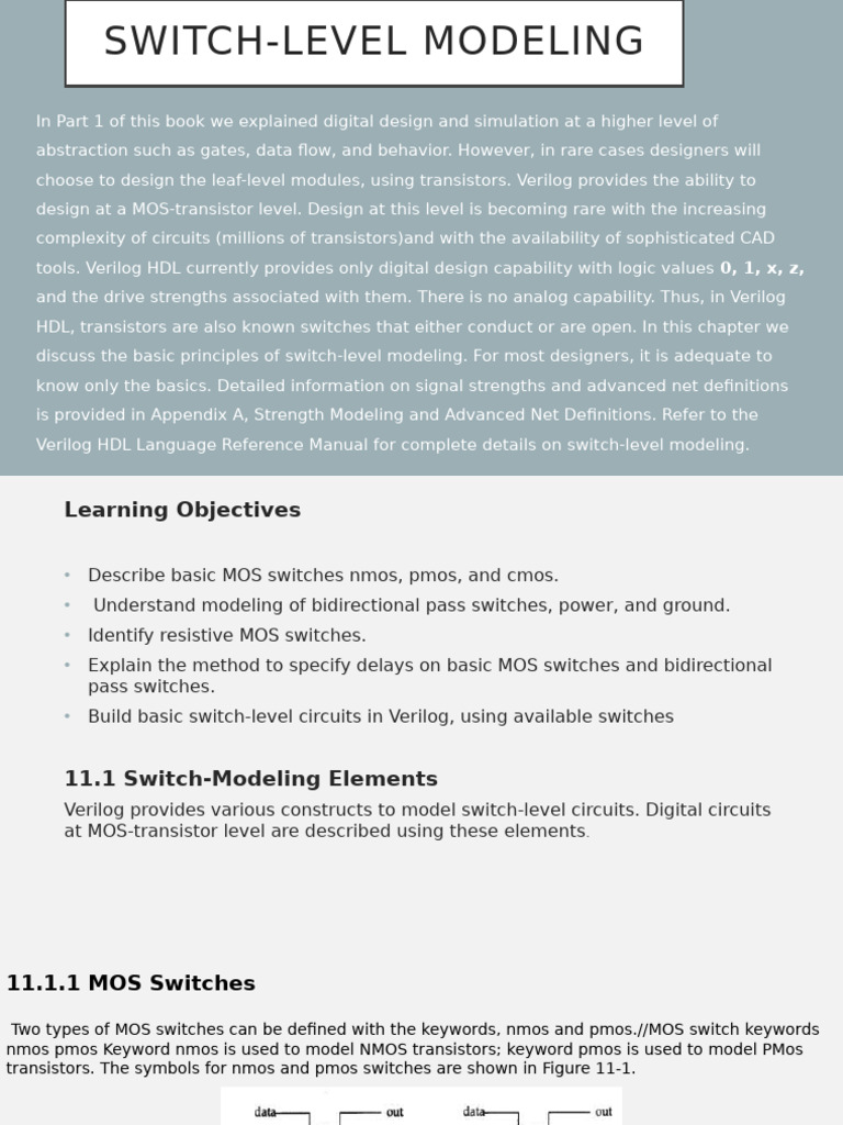 • Switch-level modeling is at a very low level of design abstraction. Designers use switch