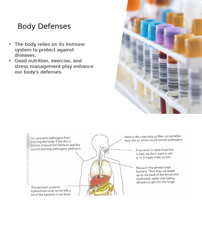 The body uses its immune system to defend against diseases. Factors such as good nutrition, exercise, and stress management contribute to strengthening these defenses. Maintaining a healthy lifestyle is essential for optimal immune function.