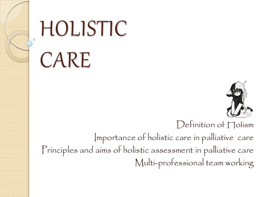 Definition of Holism Importance of holistic care in palliative care Principles and aims of holistic assessment in palliative care Multi-professional team working