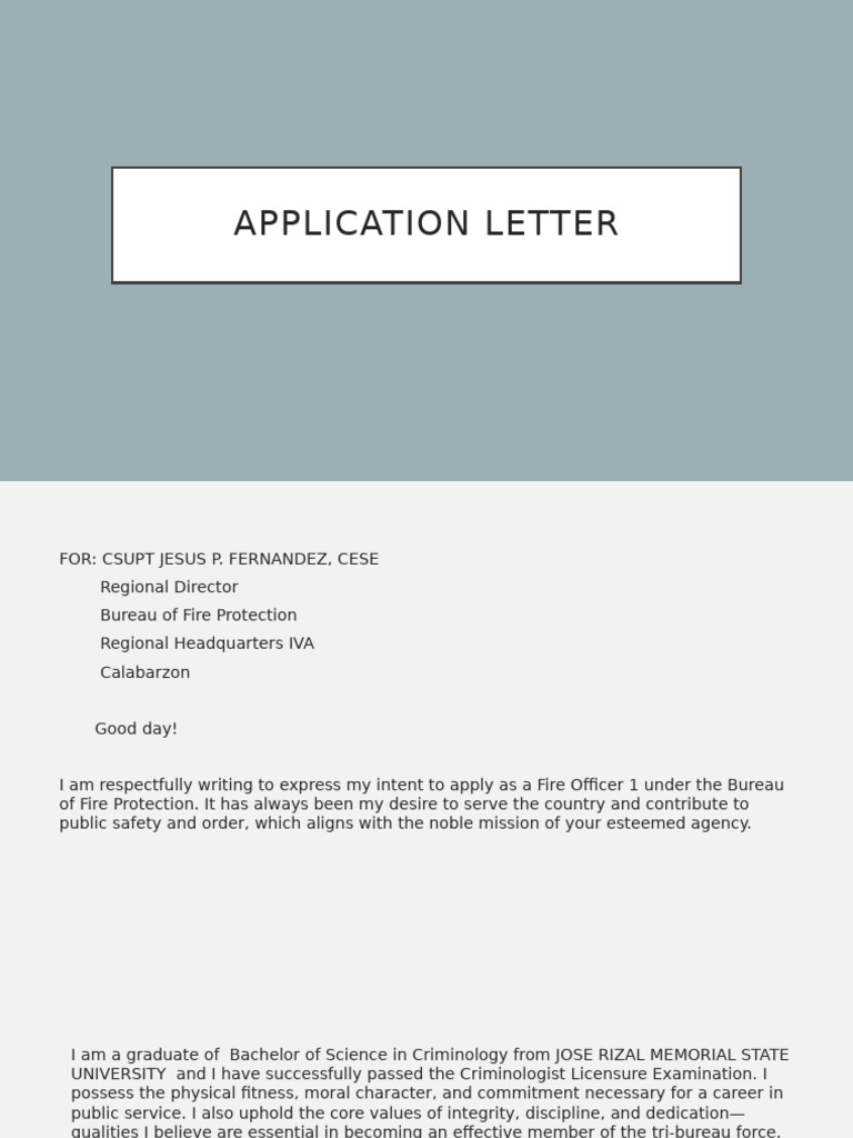 I am respectfully writing to express my intent to apply as a Fire Officer 1 under the Bureau