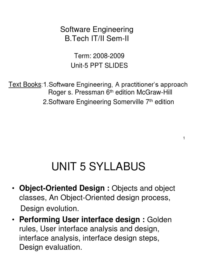 Term: 2008-2009 Unit-5 PPT SLIDES Text Books:[Link] Engineering, A practitioners approach Roger s. Pressman 6th edition McGraw-Hill [Link] Engineering Somerville 7th edition