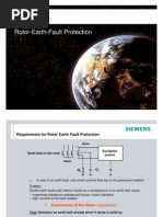 LOW FREQUENCY INJECTION METHOD MODERN ROTOR EARTH FAULT PROTECTION RELAY OPERATES ON THE PRINCIPLE OF LOW FREQUENCY INJECTION INTO THE FIELD WINDING VIA CAPACITORS. IF AN EARTH FAULT OCCURS, THE CORRESPONDING CURRENT OR RESISTANCE IS DETECTED TYP SETTING (500 MW) ALARM 40 K OHM TIME = 10 SEC TRIP 5 K OHM TIME = 1 SEC