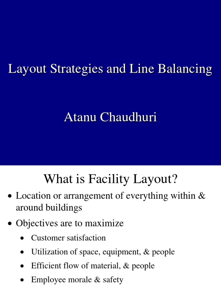 Arrange work centers so as to minimize the costs of material handling Basic cost elements are Number of loads (or people) moving between centers Distance loads moving between centers Departments having similar processes located in close proximity