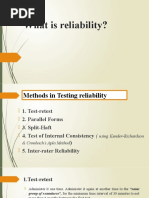 Means "repeatability" or "consistency". A measure is considered reliable if it would give us the same result over and over again Test-Retest Stability (Repeatability) Parallel Form