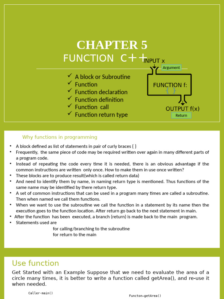 • A Caller, who calls the function, and the function called. The caller passes argument(s) to the