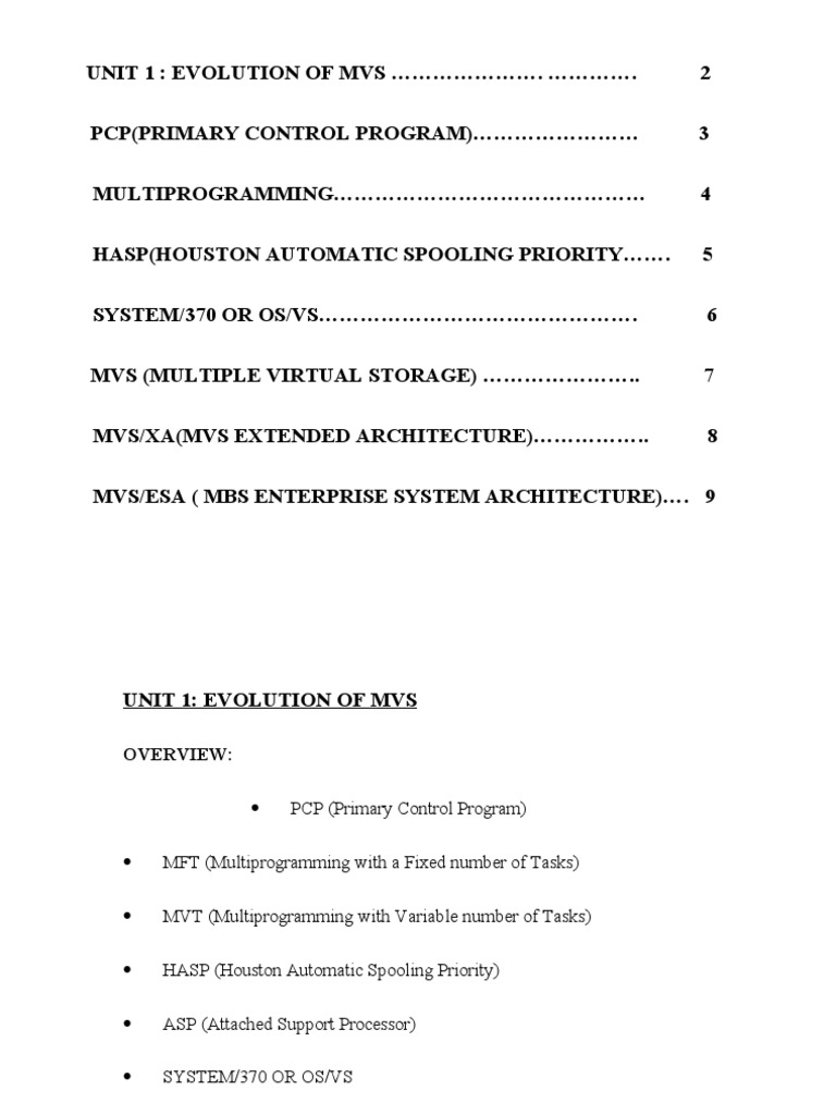 MFT (Multiprogramming with a Fixed number of Tasks) MVT (Multiprogramming with Variable number of Tasks) HASP (Houston Automatic Spooling Priority) ASP (Attached Support Processor) SYSTEM/370 OR OS/VS MVS (Multiple Virtual Storage) MVS/XA (MVS Extended Architecture)