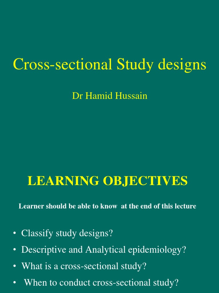 Classify study designs? Descriptive and Analytical epidemiology? What is a cross-sectional study? When to conduct cross-sectional study? How to test the hypothesis by means of a crosssectional study?