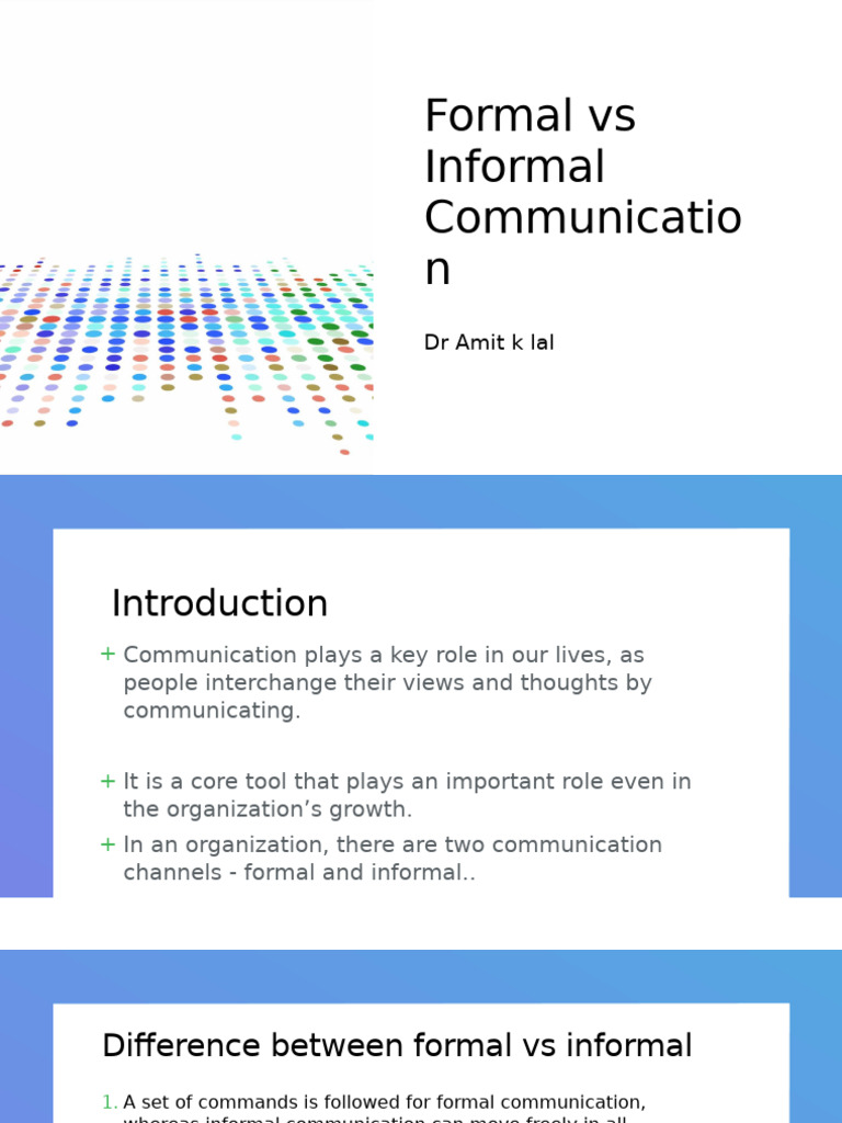 + Examples of formal communication are - business letters, reports, orders, etc.