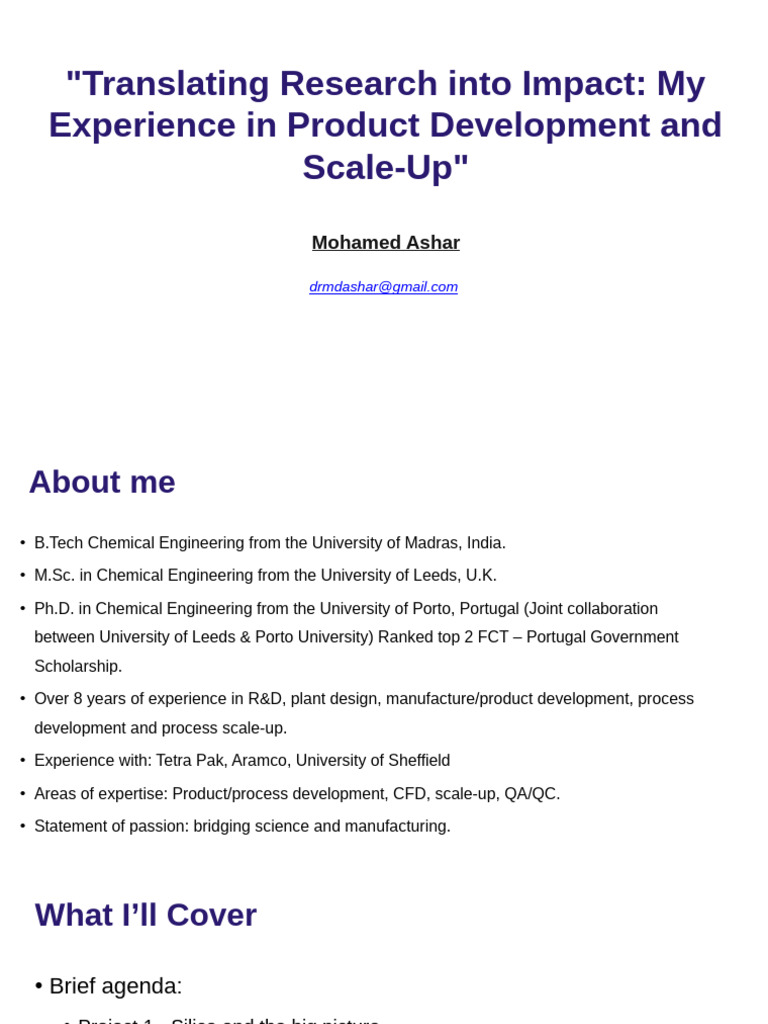 • Areas of expertise: Product/process development, CFD, scale-up, QA/QC.