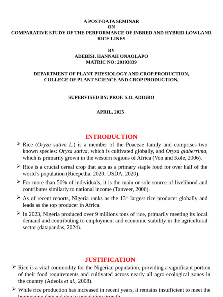 research aims to compare performance of inbred and hybrid rice lines in the Abeokuta