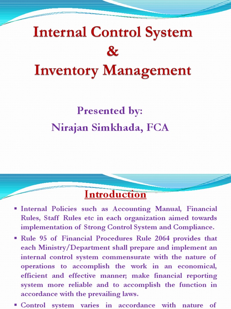 Internal Policies such as Accounting Manual, Financial Rules, Staff Rules etc in each organization aimed towards implementation of Strong Control System and Compliance. Rule 95 of Financial Procedures Rule 2064 provides that each Ministry/Department shall prepare and implement an internal control system commensurate with the nature of operations to accomplish the work in an economical, efficient and effective manner; make financial reporting system more reliable and to accomplish the function in accordance with the prevailing laws. Control system varies in accordance with nature of operations and size of the organization. However, the bottom line is it should be adequately designed and effectively implemented.