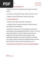 The document discusses gas exchange, focusing on the roles of alveoli and capillaries in the diffusion of oxygen and carbon dioxide. It includes an activity to illustrate the movement of these gases and provides a link to a video demonstrating the presence of CO2 in exhaled air. Key terms include diffusion and haemoglobin.