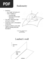 L - radiance is the amount of light radiated from a surface per solid angle 2 1 (power per unit area per unit solid angle emitted from a surface. W m sr ) E - irradiance is the amount of light falling in a surface (power per unit area incident in a surface. W m 2 )