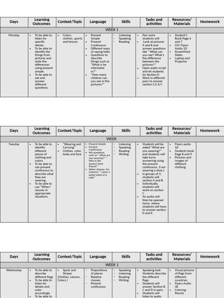 Tuesday • To be able to • “Wearing and • Present Simple - Listening • Students will be • Flyers audio