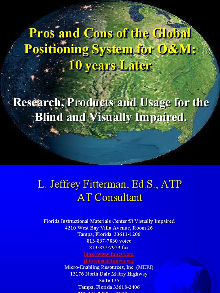 This presentation is not meant to be an in-depth explanation of GPS research, products and usage, but a means of disseminating thought provoking information on a topic of importance to those individuals that experience orientation and mobility challenges in their daily lives.