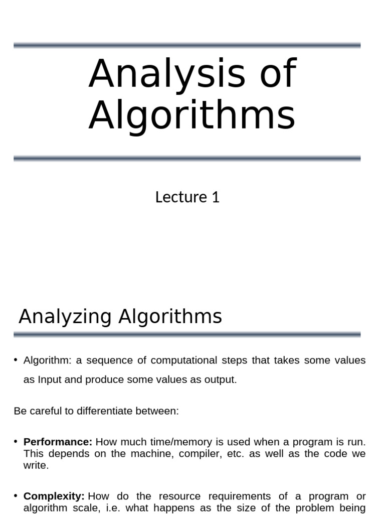 Analysis of algorithms refers to the task of determining how