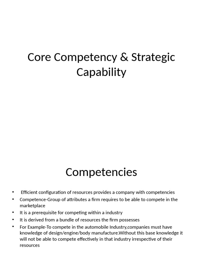 • Core Competence or Strategic Capability –Cluster of attributes that a company