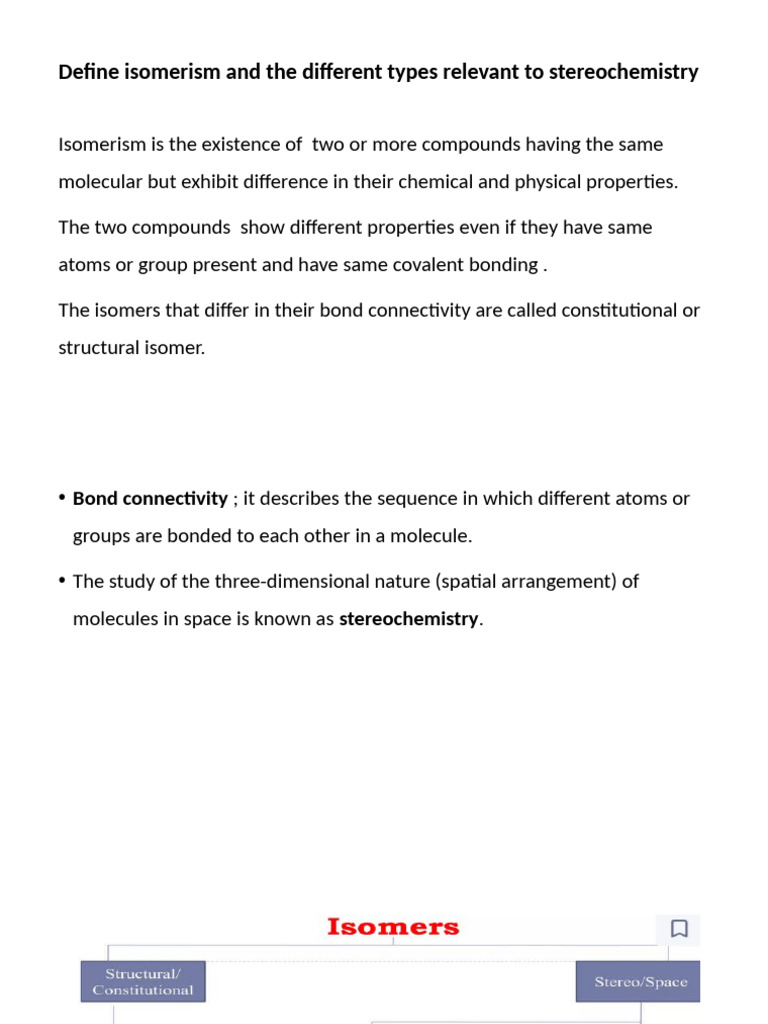 Define isomerism and the different types relevant to stereochemistry