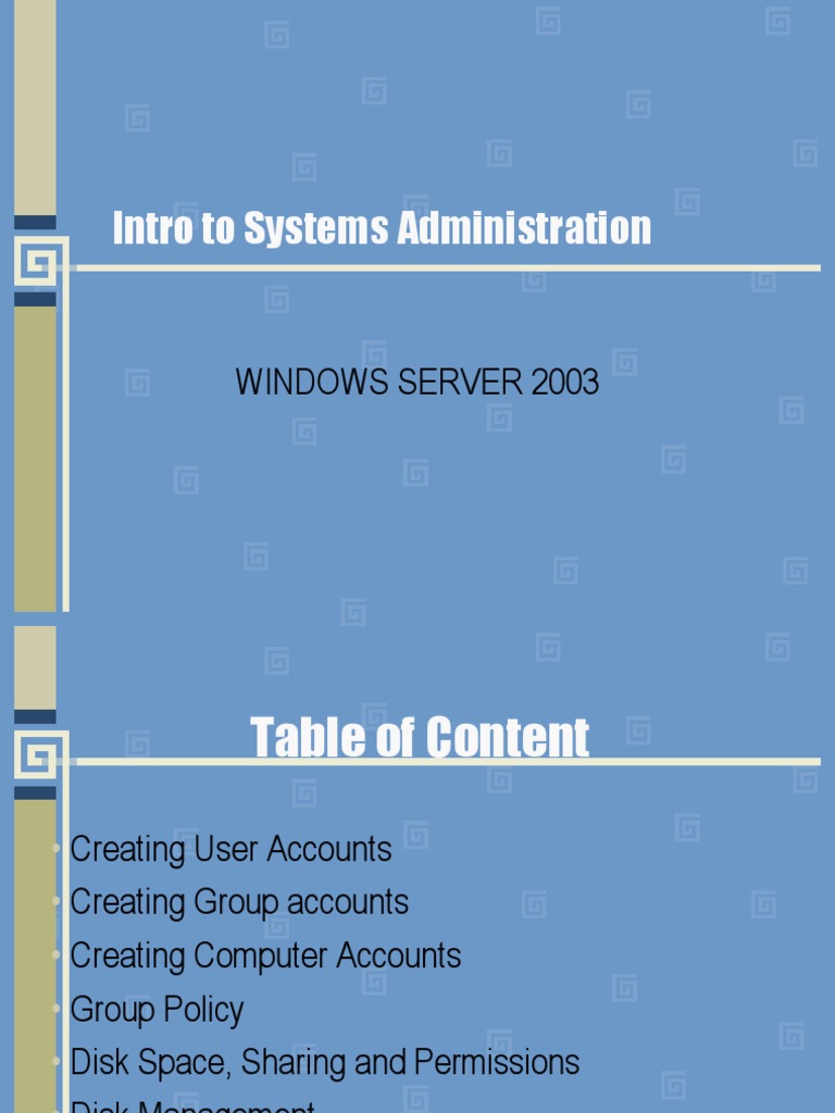 Creating User Accounts Creating Group accounts Creating Computer Accounts Group Policy Disk Space, Sharing and Permissions Disk Management