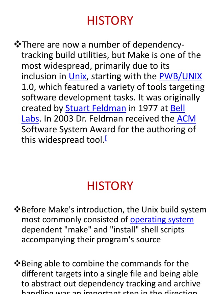 There are now a number of dependencytracking build utilities, but Make is one of the most widespread, primarily due to its inclusion in Unix, starting with the PWB/UNIX 1.0, which featured a variety of tools targeting software development tasks. It was originally created by Stuart Feldman in 1977 at Bell Labs. In 2003 Dr. Feldman received the ACM Software System Award for the authoring of this widespread tool.[