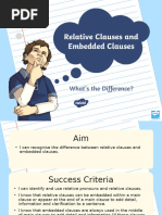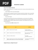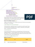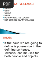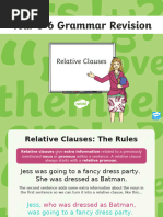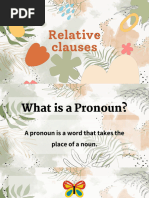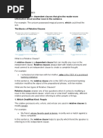 The document explains the use of relative clauses and pronouns, which help provide additional information about nouns or pronouns in sentences. It includes examples of how to identify and punctuate relative clauses, as well as exercises for adding relative clauses to sentences. Key relative pronouns mentioned are who, which, where, when, whose, and that.