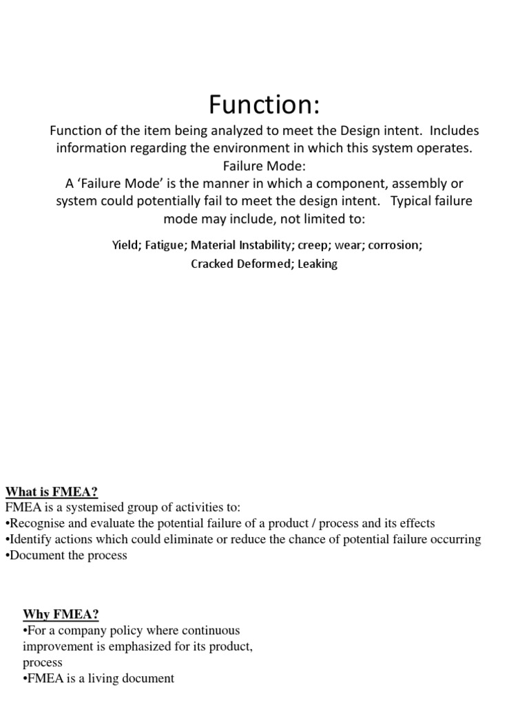 Function of the item being analyzed to meet the Design intent. Includes information regarding the environment in which this system operates. Failure Mode: A Failure Mode is the manner in which a component, assembly or system could potentially fail to meet the design intent. Typical failure mode may include, not limited to:
