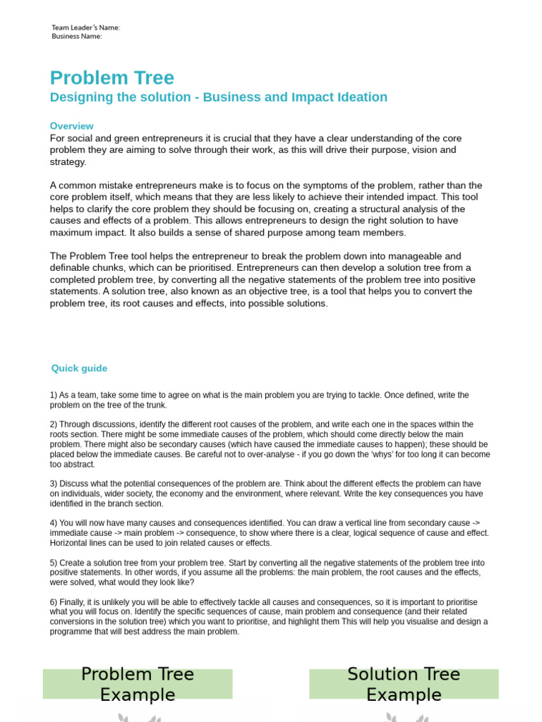 The Problem Tree tool helps the entrepreneur to break the problem down into manageable and