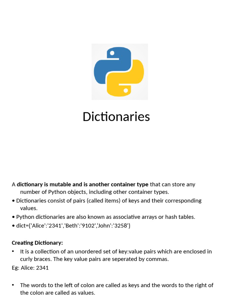 • dict={'Alice':'2341','Beth':'9102',‘John':'3258'}