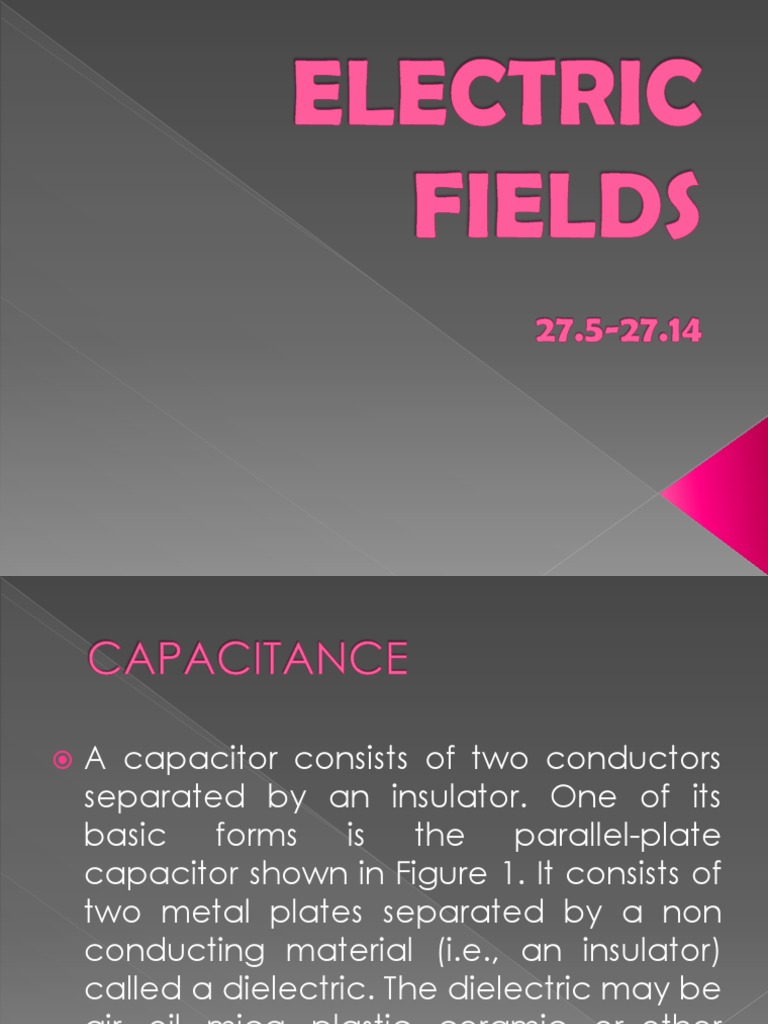 Electric Flux: Electric fields are force fields that exist in the region surrounding charged bodies. Some familiarity with electric fields is necessary to understand dielectrics and their effect on capacitance. We now look briefly at the key ideas. Consider Figure 8(a). The region where this force exists is called an electric field. To visualize this field, we use Faradays field concept. The direction of the field is defined as the direction of force on a positive charge. It is therefore directed outward from the positive charge and inward toward the negative charge as shown. Field lines never cross, and the density of the lines indicates the strength of the field; i.e., the more dense the lines, the stronger the field. Figure 8(b) shows the field of a parallel-plate capacitor. In this case, the field is uniform across the gap, with some fringing near its edges. Electric flux lines are represented by the Greek letter w (psi).