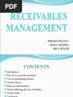 Credit Policy: Aims at maintaining a proper balance between the variables associated with receivables, like credit period, cash discount to be offered etc. Credit Evaluation: Helps in analyzing the creditworthiness of the customer. Credit Granting Decision: Helps in performing a cost-benefit analysis before extending credit to a customer Monitoring Receivables: Aims at reviewing the extent of collections made by the firm.