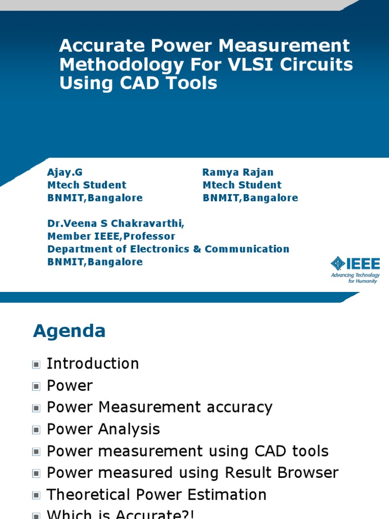Introduction Power Power Measurement accuracy Power Analysis Power measurement using CAD tools Power measured using Result Browser Theoretical Power Estimation Which is Accurate?! Comparison between the 3 methods Conclusion
