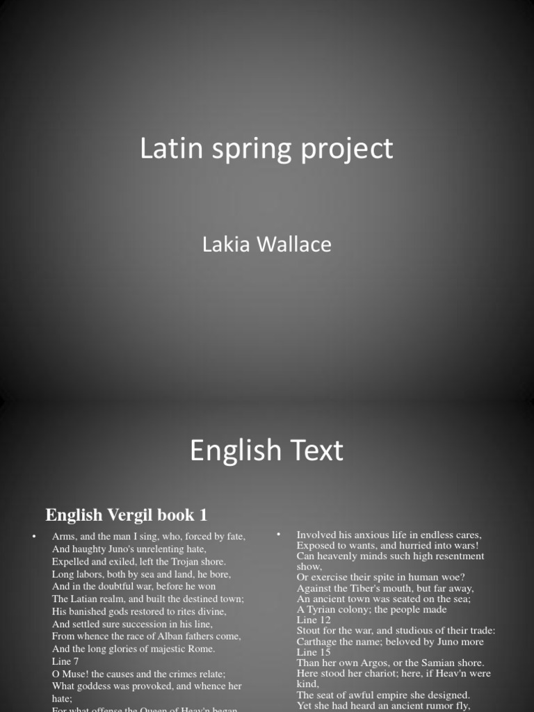 Arma virumque cano, Troiae qui primus ab oris Italiam, fato profugus, Laviniaque venit litora, multum ille et terris iactatus et alto vi superum saevae memorem Iunonis ob iram; multa quoque et bello passus, dum conderet urbem, 5 inferretque deos Latio, genus unde Latinum, Albanique patres, atque altae moenia Romae. Musa, mihi causas memora, quo numine laeso, quidve dolens, regina deum tot volvere casus insignem pietate virum, tot adire labores 10 impulerit. Tantaene animis caelestibus irae?
