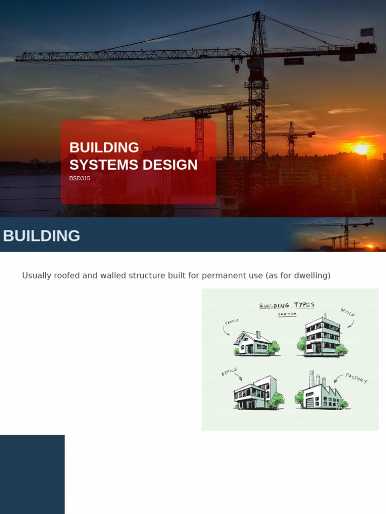 Usually roofed and walled structure built for permanent use (as for dwelling)