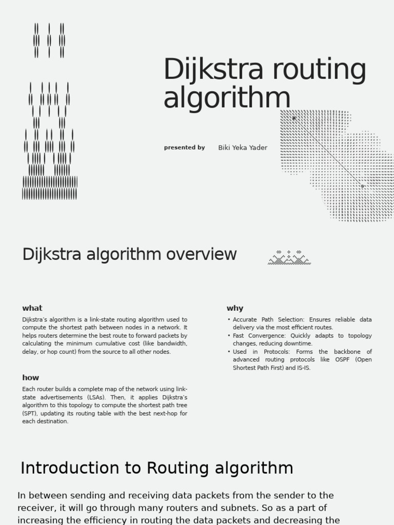 Dijkstra’s algorithm is a link-state routing algorithm used to • Accurate Path Selection: Ensures reliable data