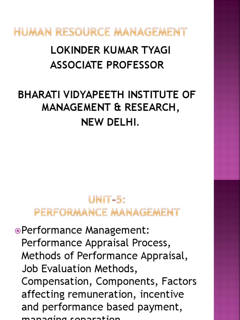 Management: Performance Appraisal Process, Methods of Performance Appraisal, Job Evaluation Methods, Compensation, Components, Factors affecting remuneration, incentive and performance based payment, managing separation.